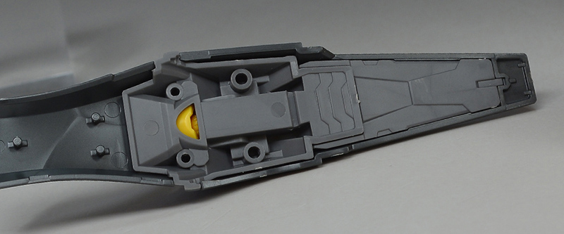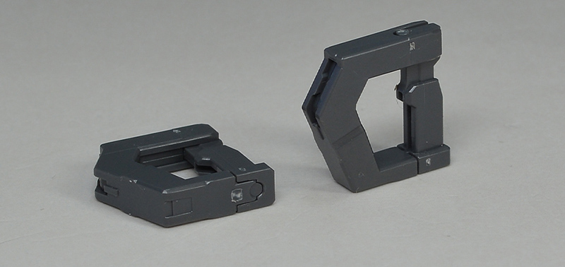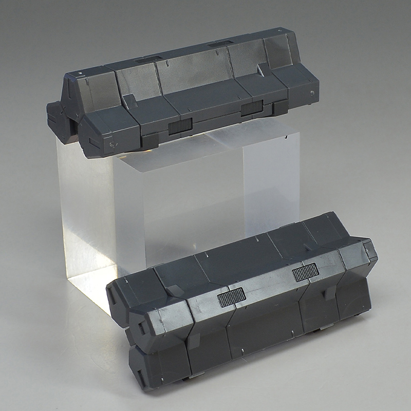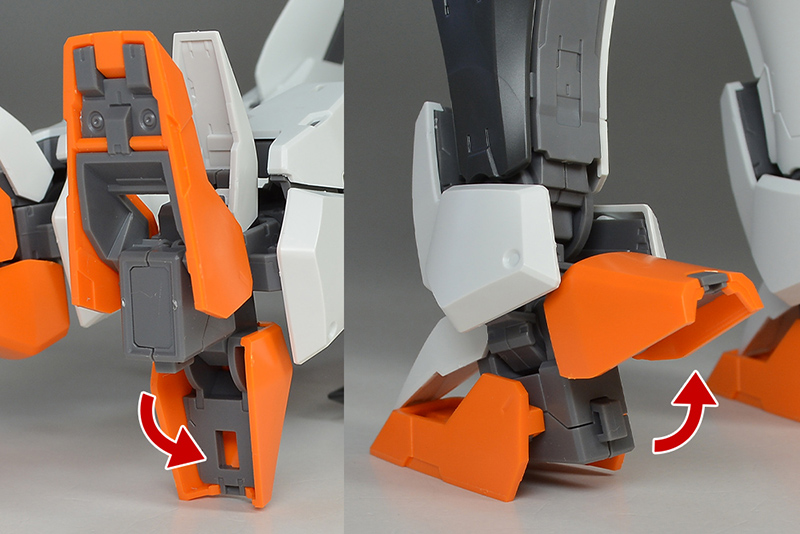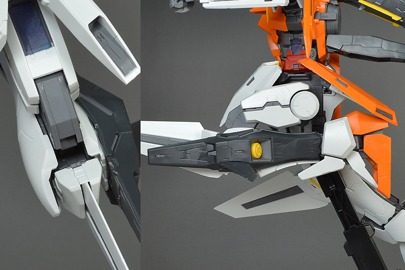 중앙부에 앵커가 있어서 프런트 아머를 고정시켜 둘 수 있습니다. 다리 가동시에는 분리되어 프런트 아머가 자유롭게 움직입니다. 중앙부는 그레이 장갑을 전개함으로써 비행 형태시 랜딩 기어로 사용 가능합니다. 리어 아머도 스토퍼가 있어서, 앵커를 꽂는 것으로 고정시킬 수 있습니다. 뒷받침 파츠도 그레이 성형색 파츠로 조형되어 있습니다.