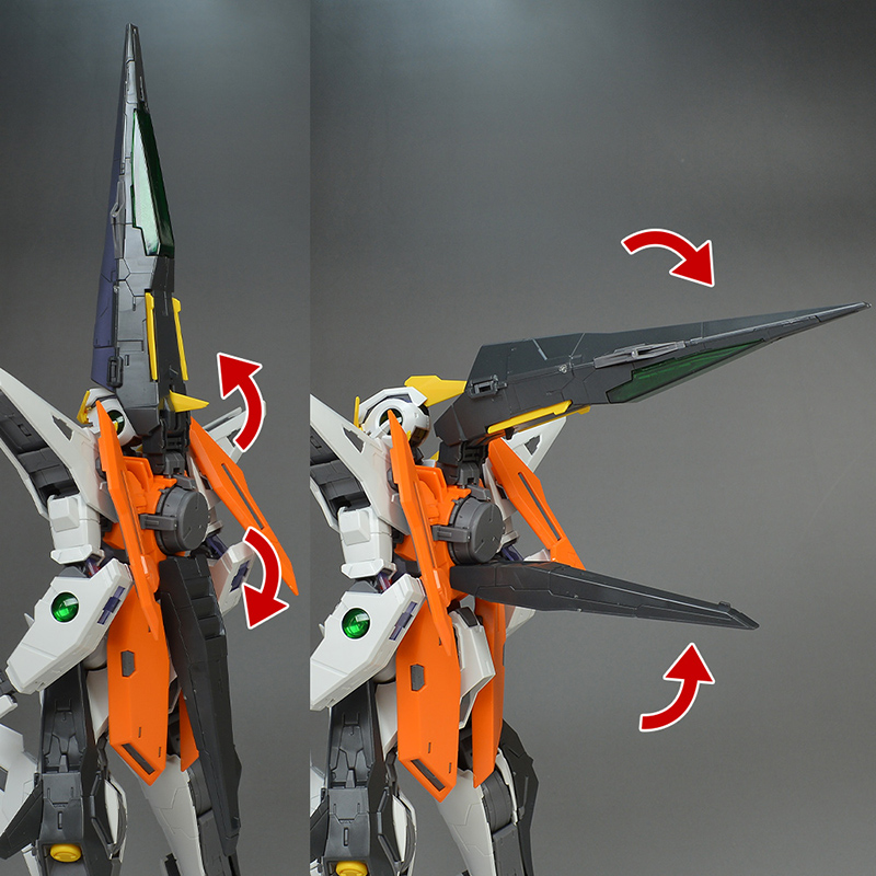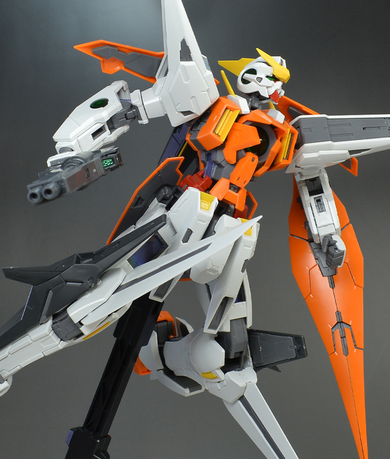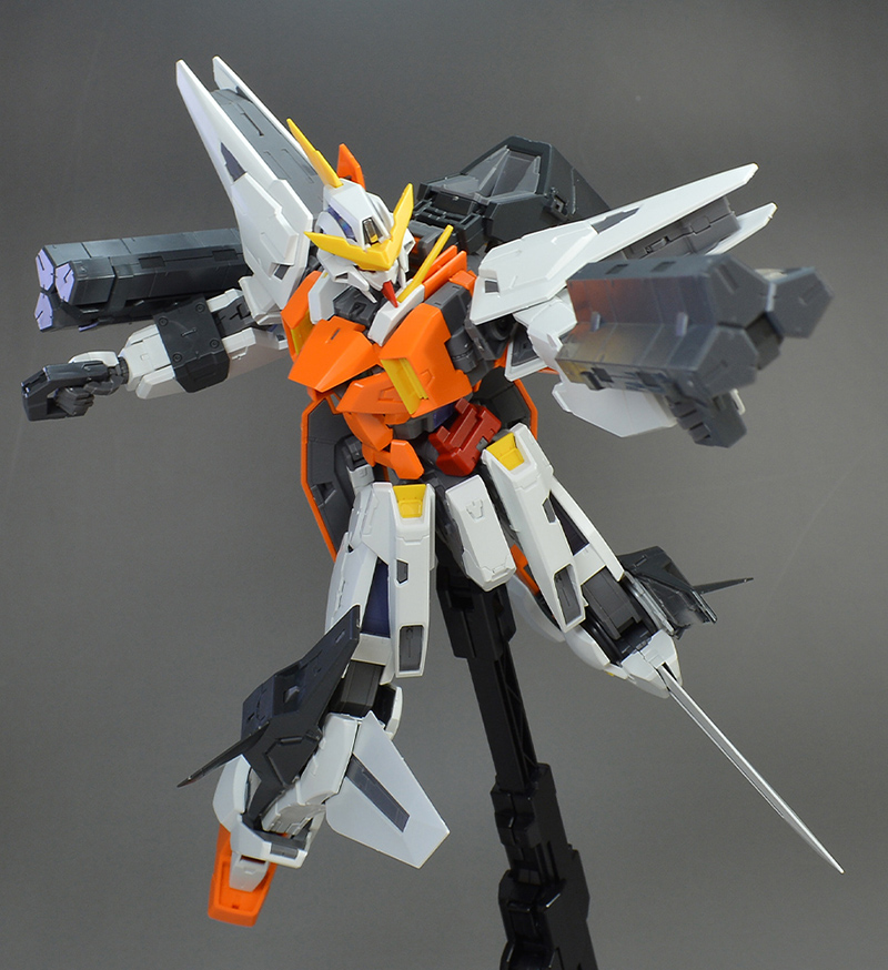 결점적으로는 1/100부터 그랬지만 무릎의 윙이나 등부 유닛, 팔꿈치의 GN 실드 등이 몸집이 커서 간섭하기 쉽습니다. 키트의 방향이나 각도를 바꾸려고 하면 걸리거나 하는 경우도 많이 있기 때문에, 포징시에 신경이 쓰일 수도 있을 것입니다.그리고 여러 번 무기 탈부착을 반복하면 무기 보유용 손가락 파츠가 빠지기 쉬워집니다. 신경이 쓰이시는 경우에는 보강해 두는 편이 더 좋을 것 같습니다.