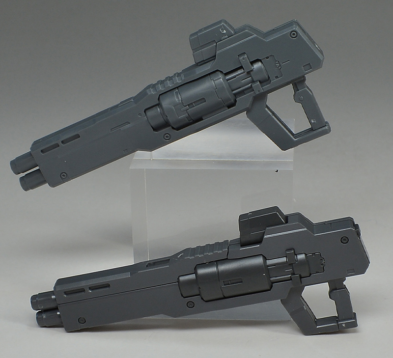무선 그립을 달아서 1/100 건담 큐리오스의 GN 빔 서브 머신건과 나란히 비교. 형상이나 사이즈는 거의 동일. 하지만 1/100은 간이적인 구조로 되어 있습니다. (사진 위가 1/100입니다.)