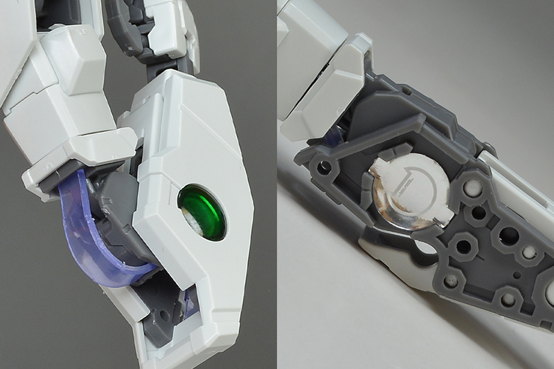 팔꿈치에도 홀로그램 시트에 의한 GN 케이블이 조형되어 있습니다. 앞팔 측면의 GN 콘덴서는 씰을 붙이고 그 위에 클리어 파츠를 씌우도록 되어 있습니다.