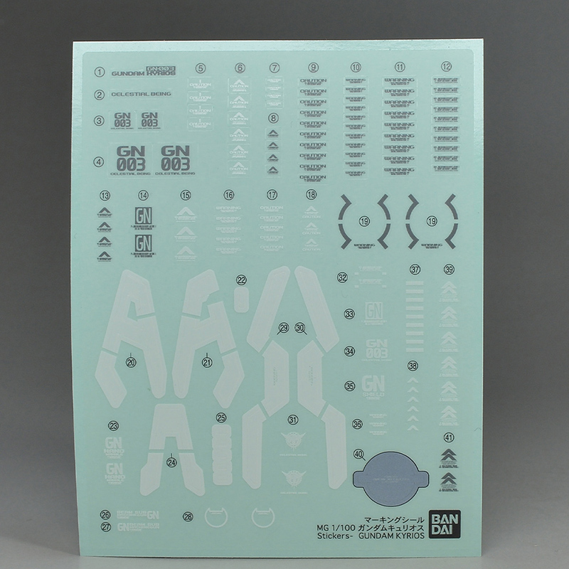 GN 실드, GN 빔 서브 머신건, 무선 그립 × 2, GN 핸드 미사일 유닛 × 2, GN 빔 사벨 칼날 × 2, GN 실드 니들 파츠, 앞팔 무기 마운트 파츠 × 2, 손가락 파츠 (무장손 : 좌우, 편손 : 좌우), 알렐루야 합티즘 피규어, 디스플레이용 파츠가 부속.