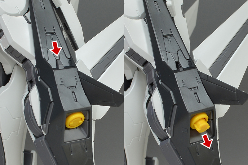 비행 형태로의 변형은 1/100과 대부분은 같습니다. 기수를 펴서 머리를 격납. 앞전팔은 각도를 바꾸고 핸드 파츠에는 무선 그립을 보유시켜 둡니다. 오른쪽 팔에는 조인트 파트를 마운트 (사진 왼쪽).숄 더 아머를 기수의 측면에 접속해, 핸드 파츠는 안쪽으로 향합니다. 다리는 허벅지 바깥으로 해둡니다 (사진 오른쪽).