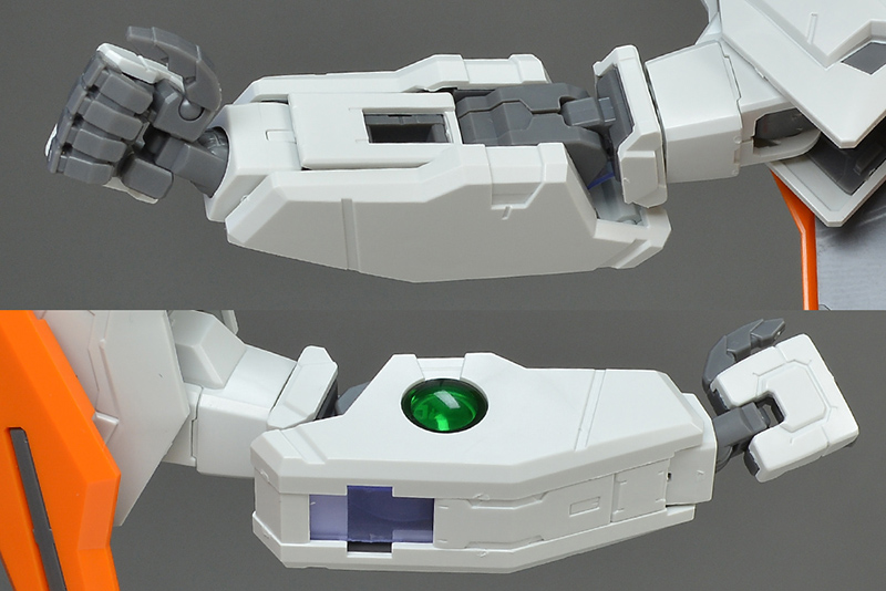 팔뚝은 통형으로 접합선이 없습니다. 앞팔도 좌우로 끼워넣는 타입으로, 접합선은 가장자리에서 몰드화되어 있습니다. 핸드 파츠는 엄지 손가락만 가동하고, 나머지 네 손가락은 재조합식. 앞팔 측면에는 클리어 그린 파츠와 클리어 파츠의 이중 구조에 의한 GN 콘덴서가, 팔꿈치 쪽에는 홀로그램 시트에 의한 GN 케이블이 조형되어 있습니다.