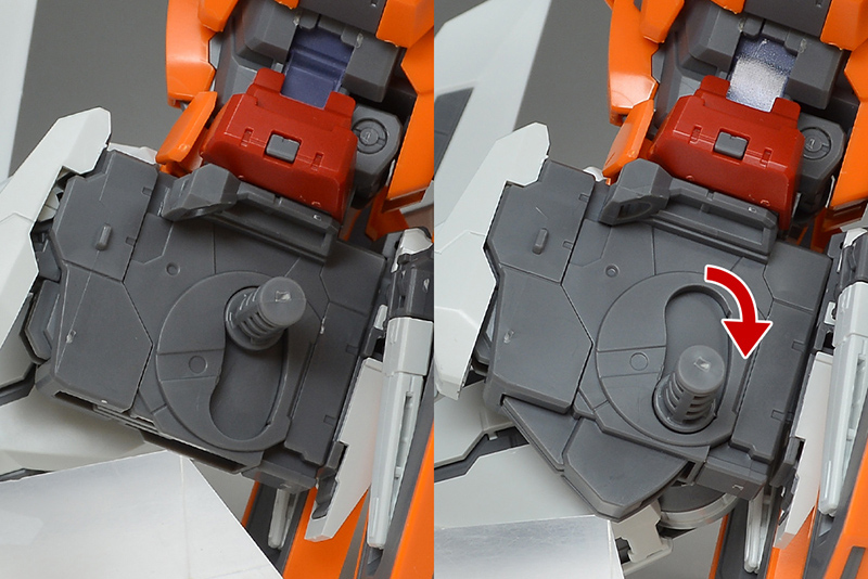 등부의 기수와 스태빌라이저를 이동시켜 간섭을 주고받는 것으로, 복부는 360도 회전이 가능합니다. 액션 베이스에는 부속된 조인트 파츠를 장착하여 디스플레이됩니다. 일단 리어 아머를 분리하여 조인트 파츠를 장착하고 다시 리어 아머를 장착합니다. 리어 아머는 단단하게 고정되어 있습니다.