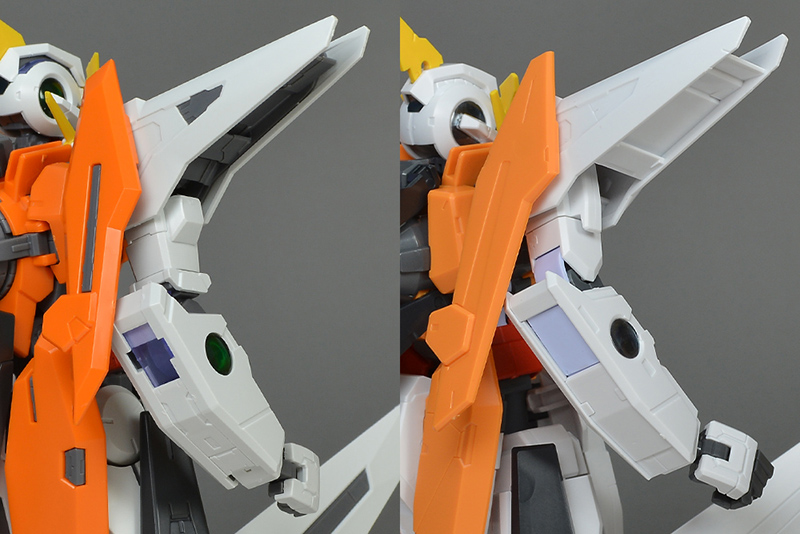 팔을 비교. 숄더 아머가 그레이로 색분할되고, 구조도 메카니컬하게. 앞팔 측면의 GN 콘덴서도 클리어 그린으로 리얼하게 재현되어 있습니다. GN 케이블의 구조도 리얼.