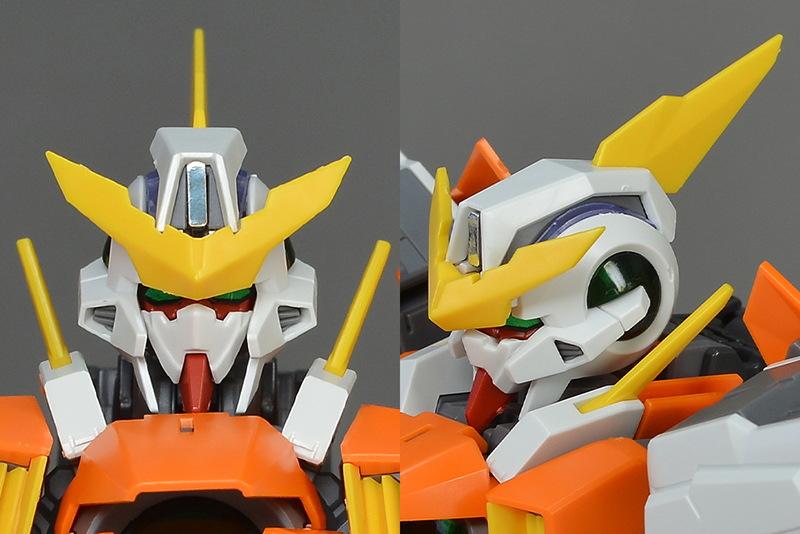 머리. 전체적으로 날렵한 느낌을 주며, 깔끔한 얼굴의 꽃미남 페이스로 되어 있습니다. 좌우 덕트는 파츠로 그레이로 색분할되되며, 눈가도 붉은 파츠로 색분할되어 있습니다. 메트부는 좌우로 끼워넣는 타입이지만, 뒤통수에 있는 접합선은 단락 몰드화되어 있습니다.