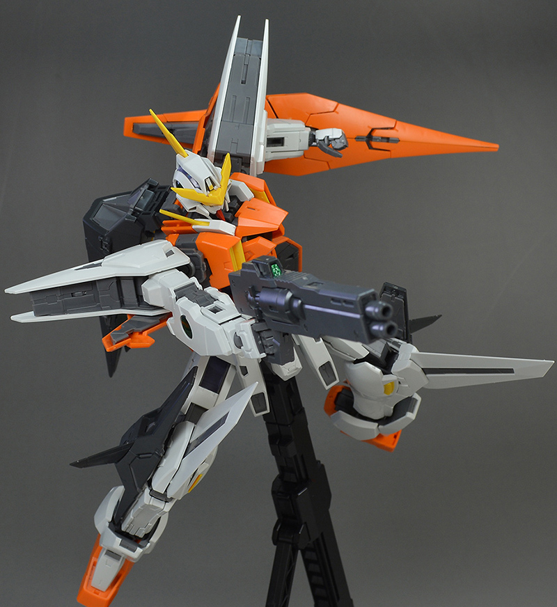 가동성의 총괄로서는 역시 각부가 세분화된 MG인 만큼 어느 부분이나 가동성이 넓습니다. 목이나 어깨, 팔꿈치, 무릎, 고간부 등은 꽤 넓게 가동하고, 복부도 몇 부분이 가동되므로 보다 부드럽고 자연스러운 포징을 즐길 수 있을 것 같습니다. 신경이 쓰이는 것은 무릎의 윙이나 등부 기수 등의 간섭 정도입니다.